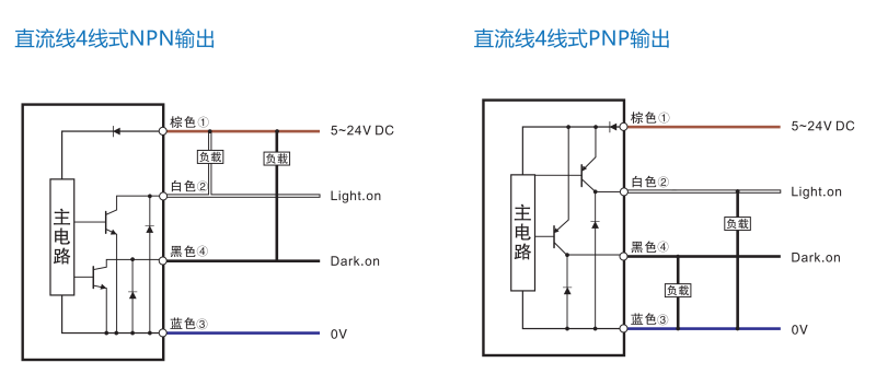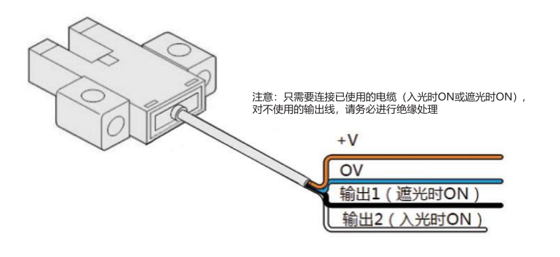 注意:只需要连接已使用的电缆(入光时ON或遮光时ON),对不使用的输出线,请务必进行绝缘处理。