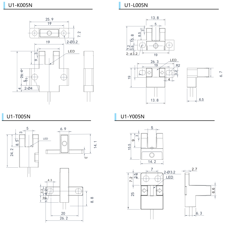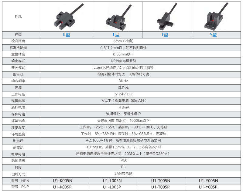 NPN输出型号:U1-K005N,U1-L005N,U1-T005N,U1-Y005N
